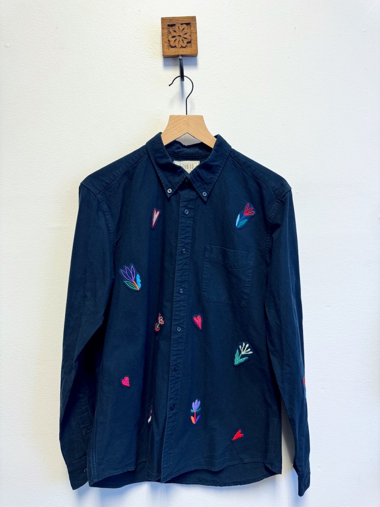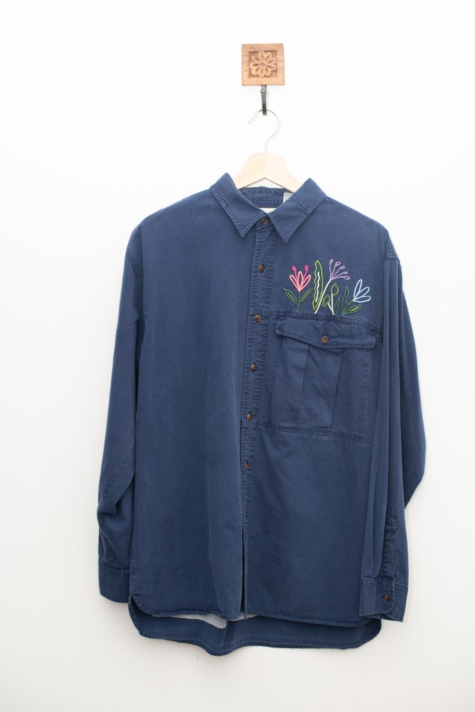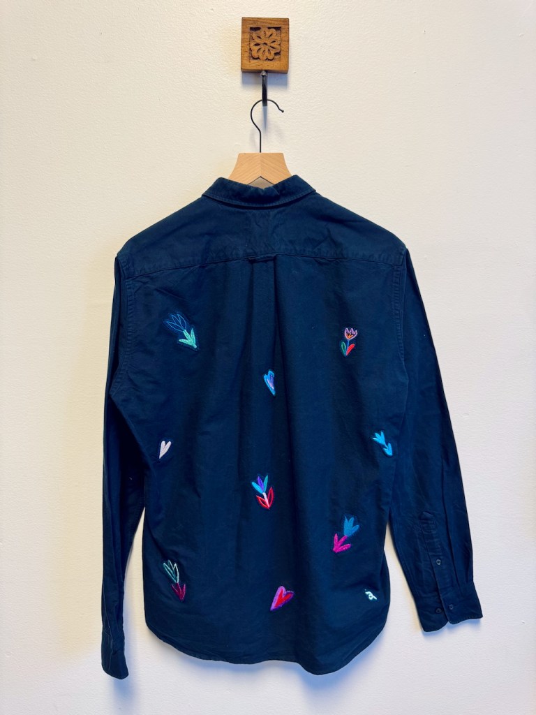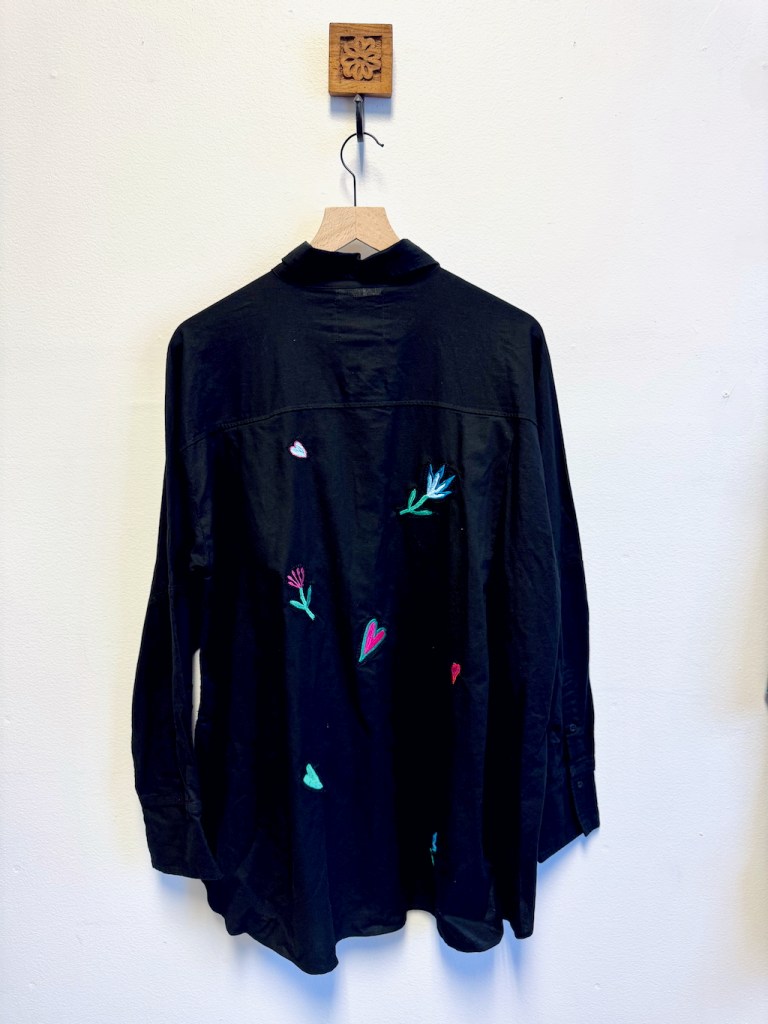 Flowers #2 is an up-cycled shirt given a new life with decorative black floral hand guided machine embroidery on both the front and back.