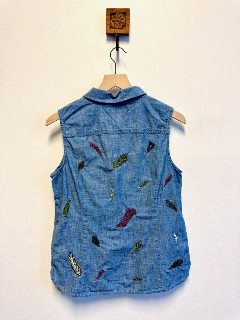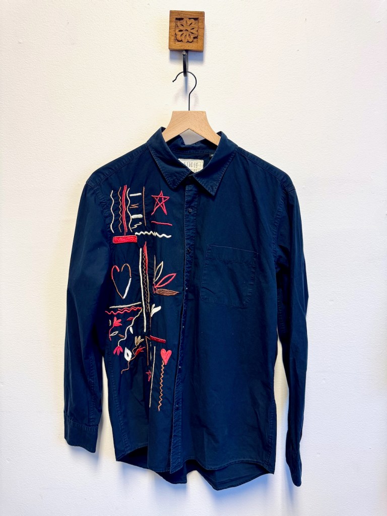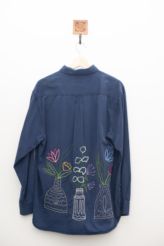 Vintage Glassware #3 is an up-cycled shirt given a new life with decorative hand guided machine embroidery on the front above the chest pocket and across the back.