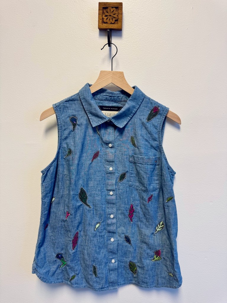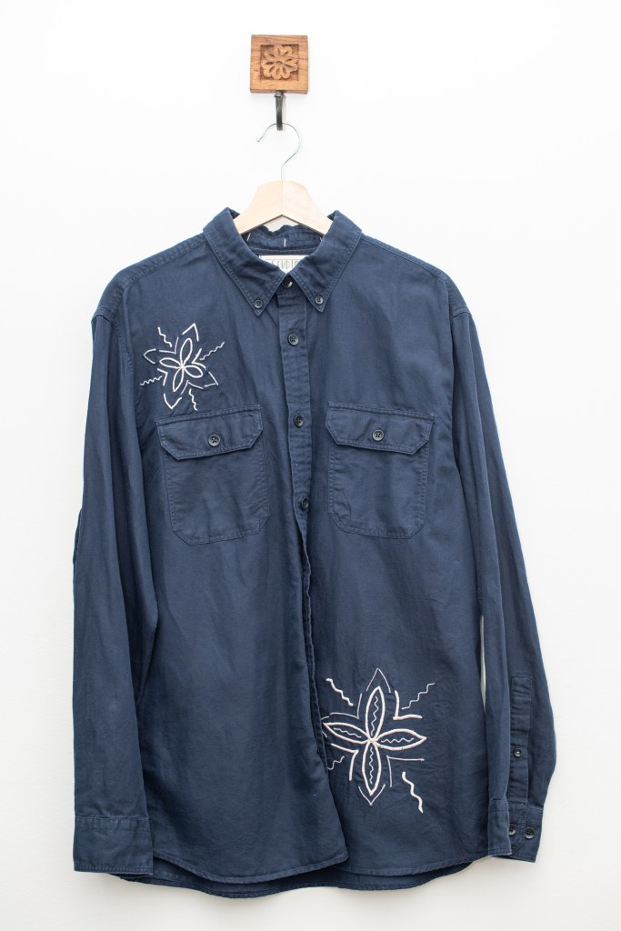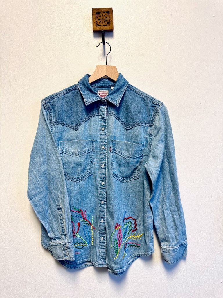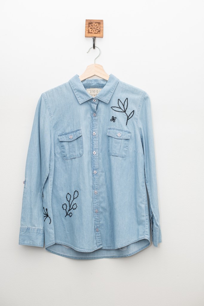 100% Cotton light denim shirt with 40 weight polyester embroidery thread known for vibrancy and durability.